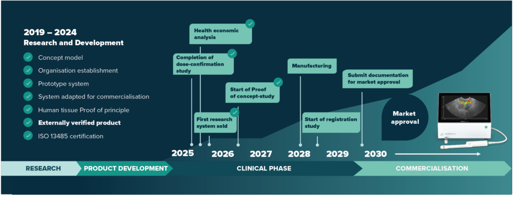 The strategy includes NanoEcho introducing a new method for improved diagnostics of early rectal cancer and applying for authority approval for its imaging system during 2029. The system shall have the functionality to meet customers’ needs and create health economic benefits.