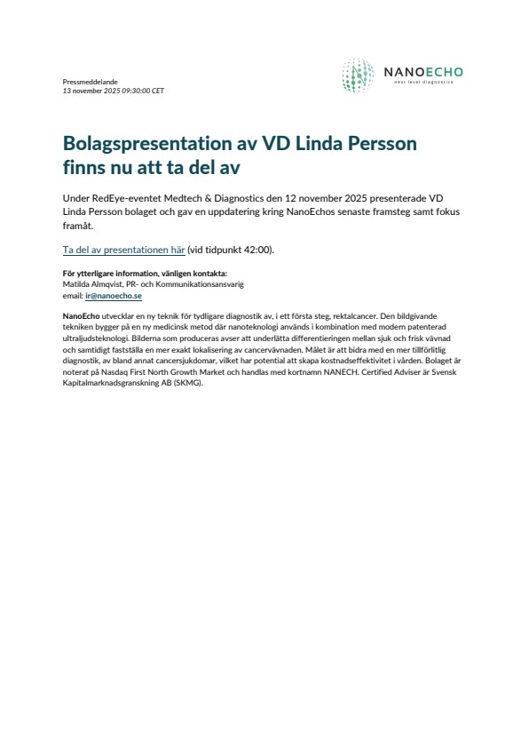 Under RedEye-eventet Medtech & Diagnostics den 12 november 2025 presenterade VD Linda Persson bolaget och gav en uppdatering kring NanoEchos senaste framsteg samt fokus framåt.