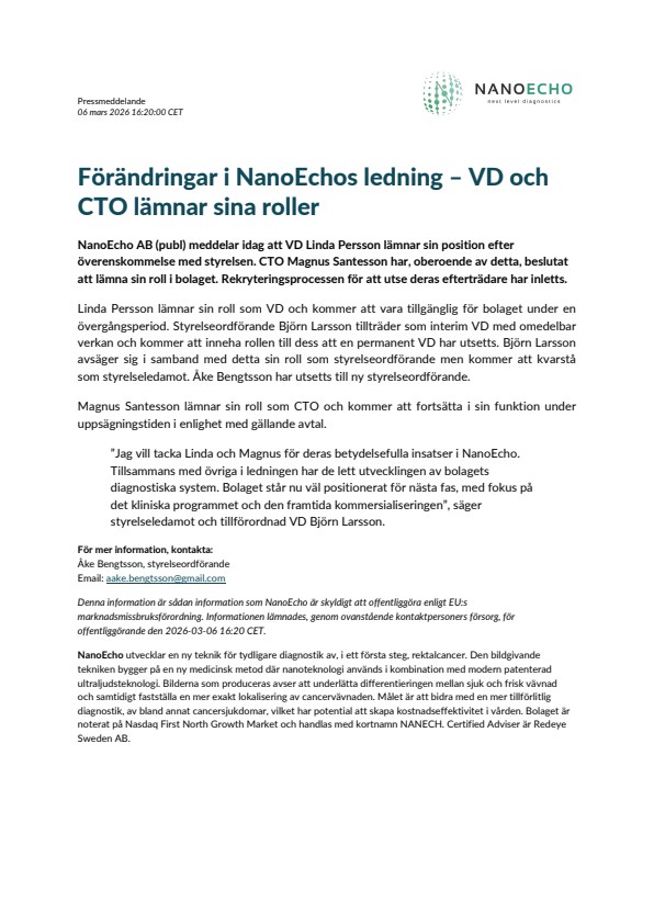 NanoEcho AB (publ) meddelar idag att VD Linda Persson lämnar sin position efter överenskommelse med styrelsen. CTO Magnus Santesson har, oberoende av detta, beslutat att lämna sin roll i bolaget. Rekryteringsprocessen för att utse deras efterträdare har inletts.