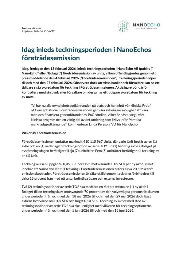 Idag, fredagen den 13 februari 2026, inleds teckningsperioden i NanoEcho AB (publ):s (”NanoEcho” eller ”Bolaget”) företrädesemission av units, vilken offentliggjordes genom ett pressmeddelande den 4 februari 2026 (”Företrädesemissionen”). Teckningsperioden löper till och med den 27 februari 2026. Observera dock att vissa banker och förvaltare kan ha ett tidigare sista svarsdatum för teckning i Företrädesemissionen. Aktieägare bör därför kontrollera med sin bank eller förvaltare om dessa har ett tidigare svarsdatum för teckning av units.