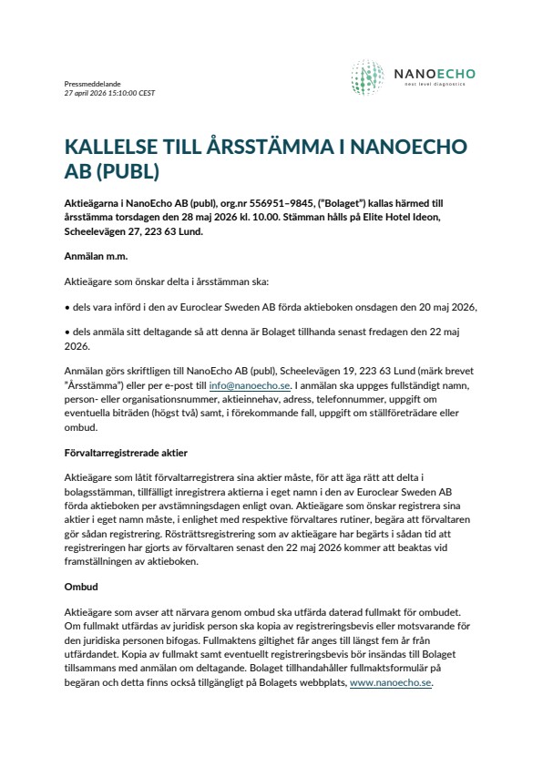 Aktieägarna i NanoEcho AB (publ), org.nr 556951–9845, (”Bolaget”) kallas härmed till årsstämma torsdagen den 28 maj 2026 kl. 10.00. Stämman hålls på Elite Hotel Ideon, Scheelevägen 27, 223 63 Lund.
