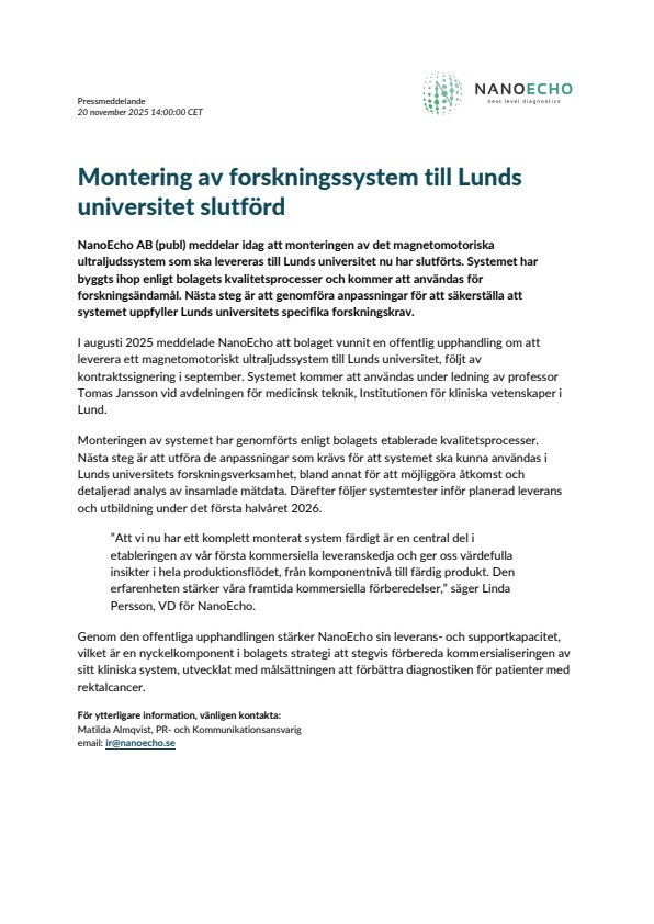 I augusti 2025 meddelade NanoEcho att bolaget vunnit en offentlig upphandling om att leverera ett magnetomotoriskt ultraljudssystem till Lunds universitet, följt av kontraktssignering i september. Systemet kommer att användas under ledning av professor Tomas Jansson vid avdelningen för medicinsk teknik, Institutionen för kliniska vetenskaper i Lund.