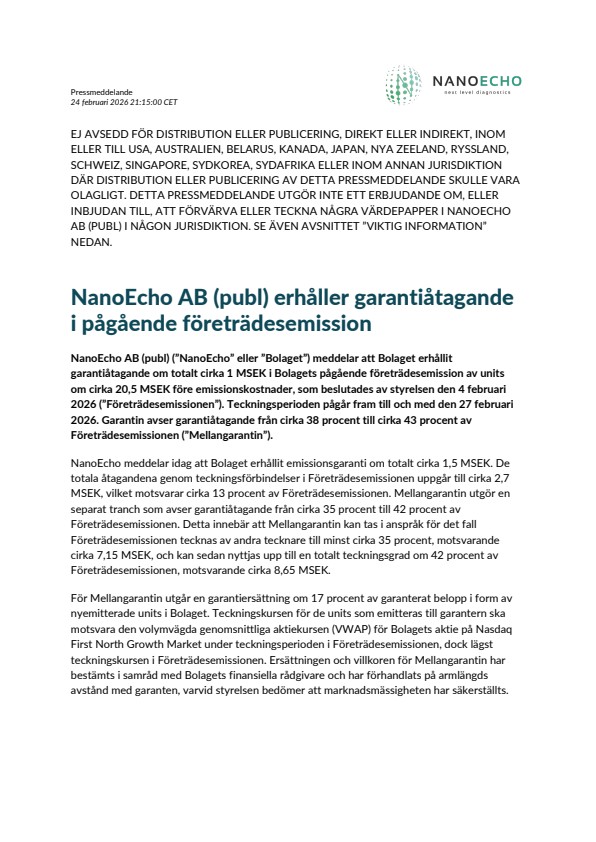 NanoEcho AB (publ) (”NanoEcho” eller ”Bolaget”) meddelar att Bolaget erhållit garantiåtagande om totalt cirka 1 MSEK i Bolagets pågående företrädesemission av units om cirka 20,5 MSEK före emissionskostnader, som beslutades av styrelsen den 4 februari 2026 (”Företrädesemissionen”). Teckningsperioden pågår fram till och med den 27 februari 2026. Garantin avser garantiåtagande från cirka 38 procent till cirka 43 procent av Företrädesemissionen (”Mellangarantin”).