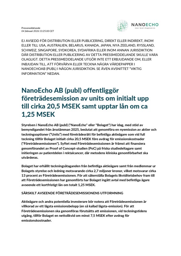 Fullständiga villkor för Företrädesemissionen samt övrig information om NanoEcho kommer att presenteras i informationsmemorandumet som förväntas publiceras av Bolaget på dess hemsida, www.NanoEcho.se, omkring den 12 februari 2026.