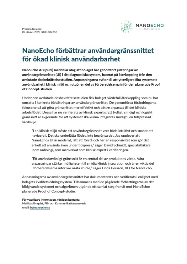 ”Ett användarvänligt gränssnitt är en central del av produktens värde. Våra anpassningar stärker möjligheten till smidig klinisk integration och är en viktig del i förberedelserna inför vår nästa studie,” säger Linda Persson, VD för NanoEcho.