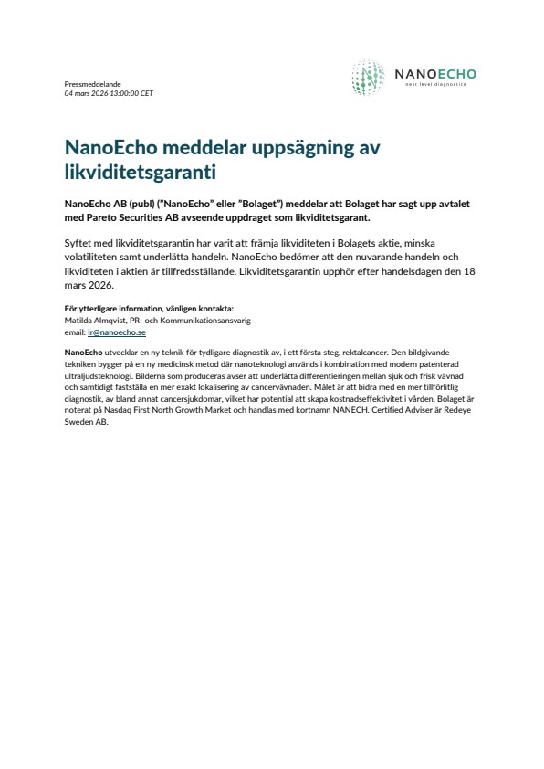 Syftet med likviditetsgarantin har varit att främja likviditeten i Bolagets aktie, minska volatiliteten samt underlätta handeln. NanoEcho bedömer att den nuvarande handeln och likviditeten i aktien är tillfredsställande. Likviditetsgarantin upphör efter handelsdagen den 18 mars 2026.