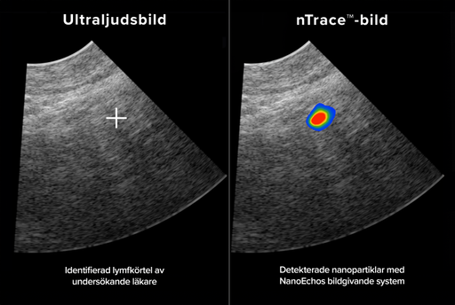 NanoEcho AB (publ) presenterar idag för första gången en bild från en klinisk undersökning. Bilden visar hur vibrerande järnoxidbaserade nanopartiklar – den så kallade nTrace-signalen – detekteras i en lymfkörtel hos en människa med bolagets diagnostiska system.