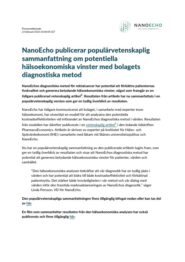NanoEcho har tidigare kommunicerat att bolaget, i samarbete med experter inom hälsoekonomi, har utvecklat en modell för att analysera den potentiella kostnadseffektiviteten vid införandet av NanoEchos diagnostiska metod i vården. Resultaten från modellen har därefter publicerats i en vetenskaplig artikel1 i den ledande tidskriften PharmacoEconomics. Artikeln är skriven av experter på Institutet för Hälso- och Sjukvårdsekonomi (IHE) i samarbete med läkare vid Skånes universitetssjukhus och NanoEcho.
