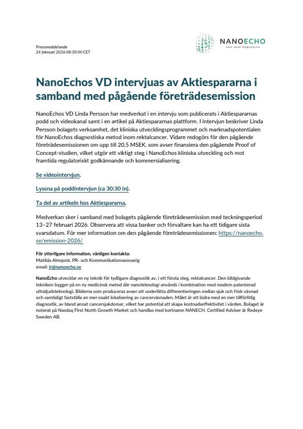 NanoEchos VD Linda Persson har medverkat i en intervju som publicerats i Aktiespararnas podd och videokanal samt i en artikel på Aktiespararnas plattform. I intervjun beskriver Linda Persson bolagets verksamhet, det kliniska utvecklingsprogrammet och marknadspotentialen för NanoEchos diagnostiska metod inom rektalcancer. Vidare redogörs för den pågående företrädesemissionen om upp till 20,5 MSEK, som avser finansiera den pågående Proof of Concept-studien, vilket utgör ett viktigt steg i NanoEchos kliniska utveckling och mot framtida regulatoriskt godkännande och kommersialisering.