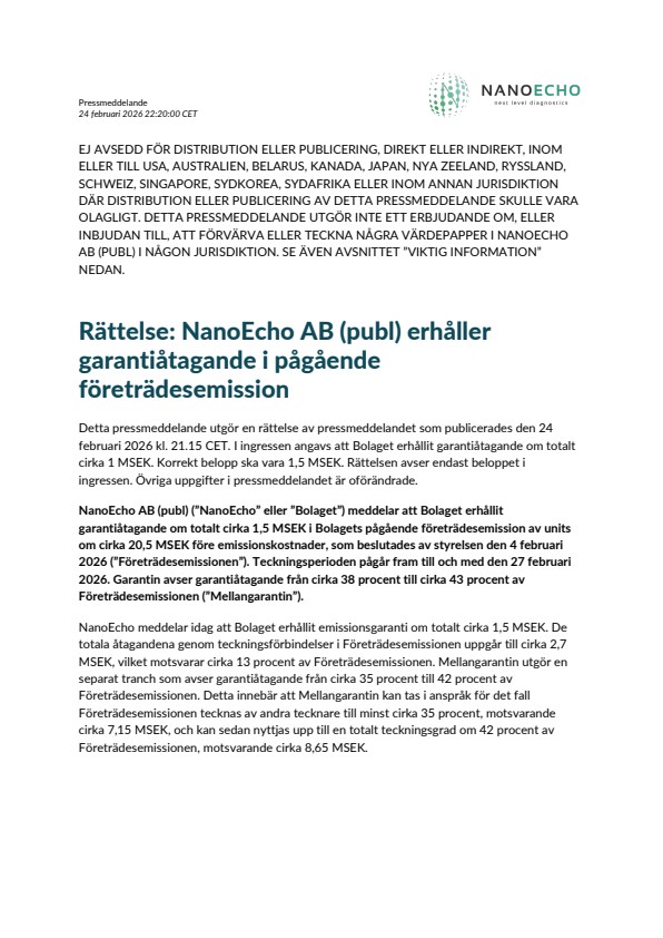 NanoEcho AB (publ) (”NanoEcho” eller ”Bolaget”) meddelar att Bolaget erhållit garantiåtagande om totalt cirka 1,5 MSEK i Bolagets pågående företrädesemission av units om cirka 20,5 MSEK före emissionskostnader, som beslutades av styrelsen den 4 februari 2026 (”Företrädesemissionen”). Teckningsperioden pågår fram till och med den 27 februari 2026. Garantin avser garantiåtagande från cirka 38 procent till cirka 43 procent av Företrädesemissionen (”Mellangarantin”).