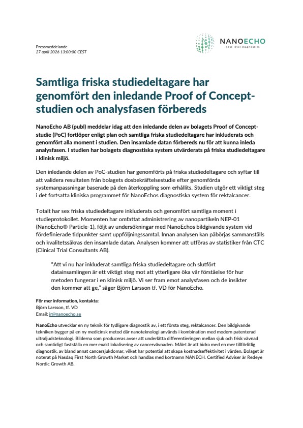 NanoEcho AB (publ) meddelar idag att den inledande delen av bolagets Proof of Concept-studie (PoC) fortlöper enligt plan och samtliga friska studiedeltagare har inkluderats och genomfört alla moment i studien. Den insamlade datan förbereds nu för att kunna inleda analysfasen. I studien har bolagets diagnostiska system utvärderats på friska studiedeltagare i klinisk miljö.