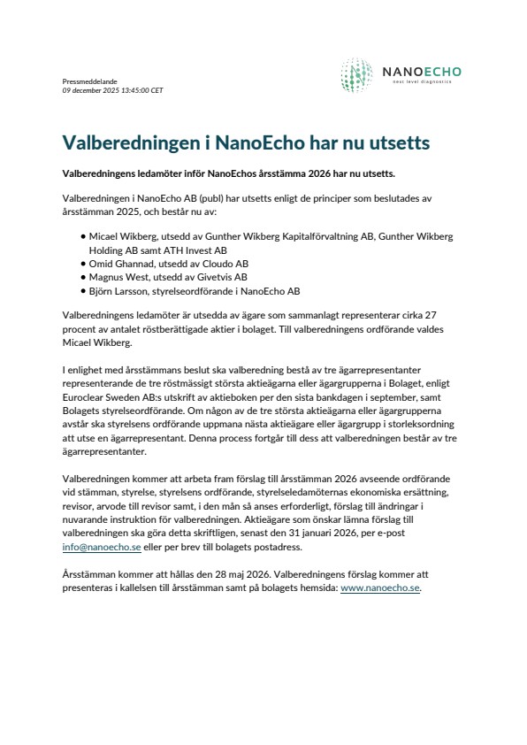 Årsstämman kommer att hållas den 28 maj 2026. Valberedningens förslag kommer att presenteras i kallelsen till årsstämman samt på bolagets hemsida: www.nanoecho.se.