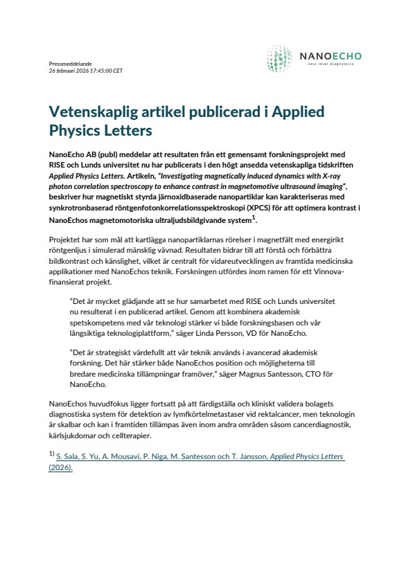 NanoEcho AB (publ) meddelar att resultaten från ett gemensamt forskningsprojekt med RISE och Lunds universitet nu har publicerats i den högt ansedda vetenskapliga tidskriften Applied Physics Letters. Artikeln, “Investigating magnetically induced dynamics with X-ray photon correlation spectroscopy to enhance contrast in magnetomotive ultrasound imaging”, beskriver hur magnetiskt styrda järnoxidbaserade nanopartiklar kan karakteriseras med synkrotronbaserad röntgenfotonkorrelationsspektroskopi (XPCS) för att optimera kontrast i NanoEchos magnetomotoriska ultraljudsbildgivande system1.